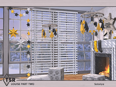 Includes 11 objects: three ceiling decors, christmas tree, coffee table, fireplace, hallway table, two poufs, shelf, table light.